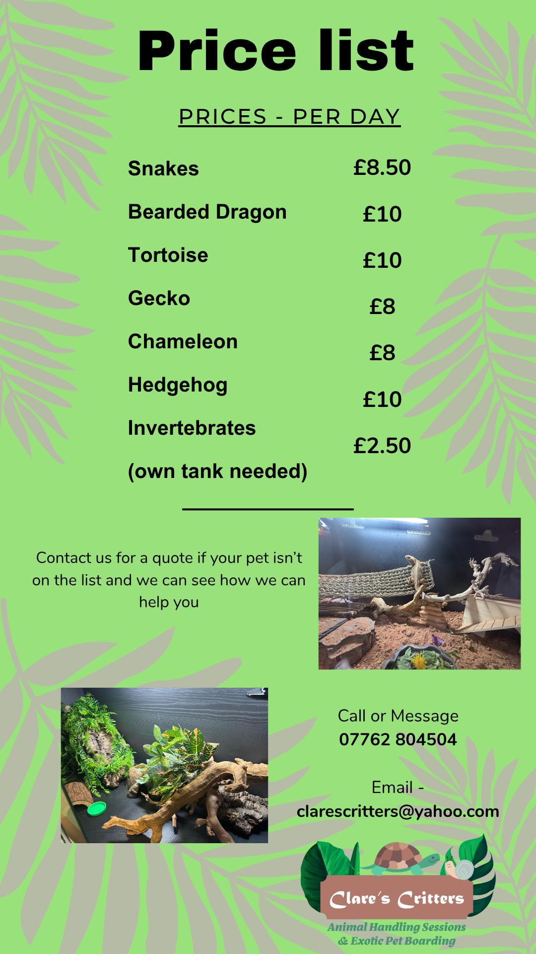 As part of Clare's Critters we also offer a 'Hideaway' for your exotic pets whilst you are on holiday. Taking the stress out of providing a safe and comfortable retreat for your pets.